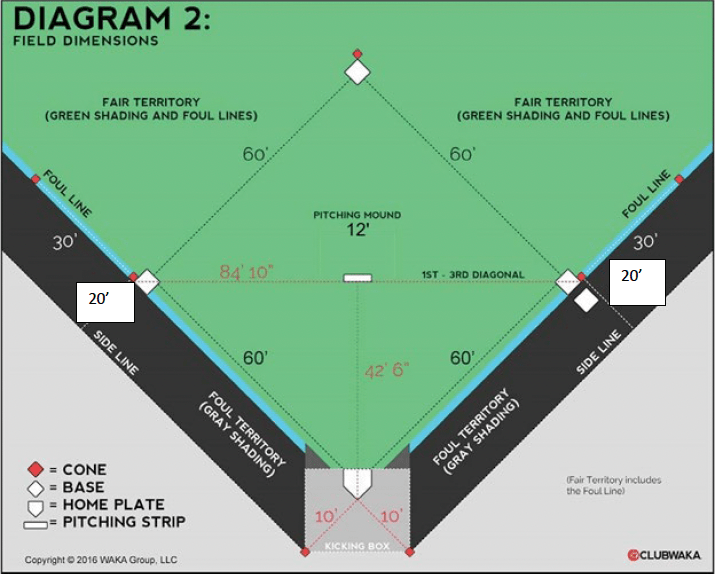 f. when available, cones are placed: at the outside corner of first, second, and third base, and not touching the base; on the foul lines 30 feet or about 10 paces behind first and third base; and on the sidelines 10′ from home plate;