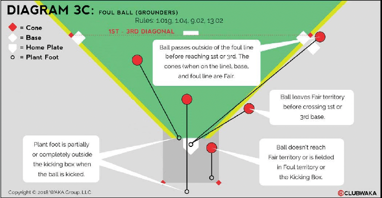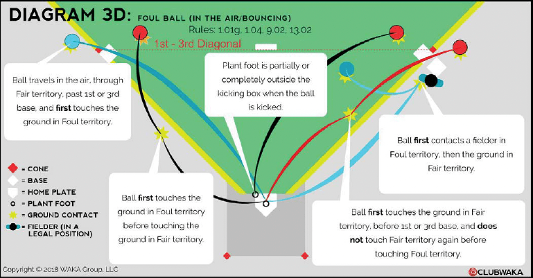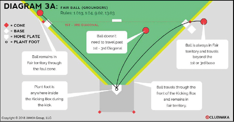 b. a kicked ball landing in fair territory then traveling into foul territory at or beyond 1st or 3rd base (see Diagram 3A, 3B).